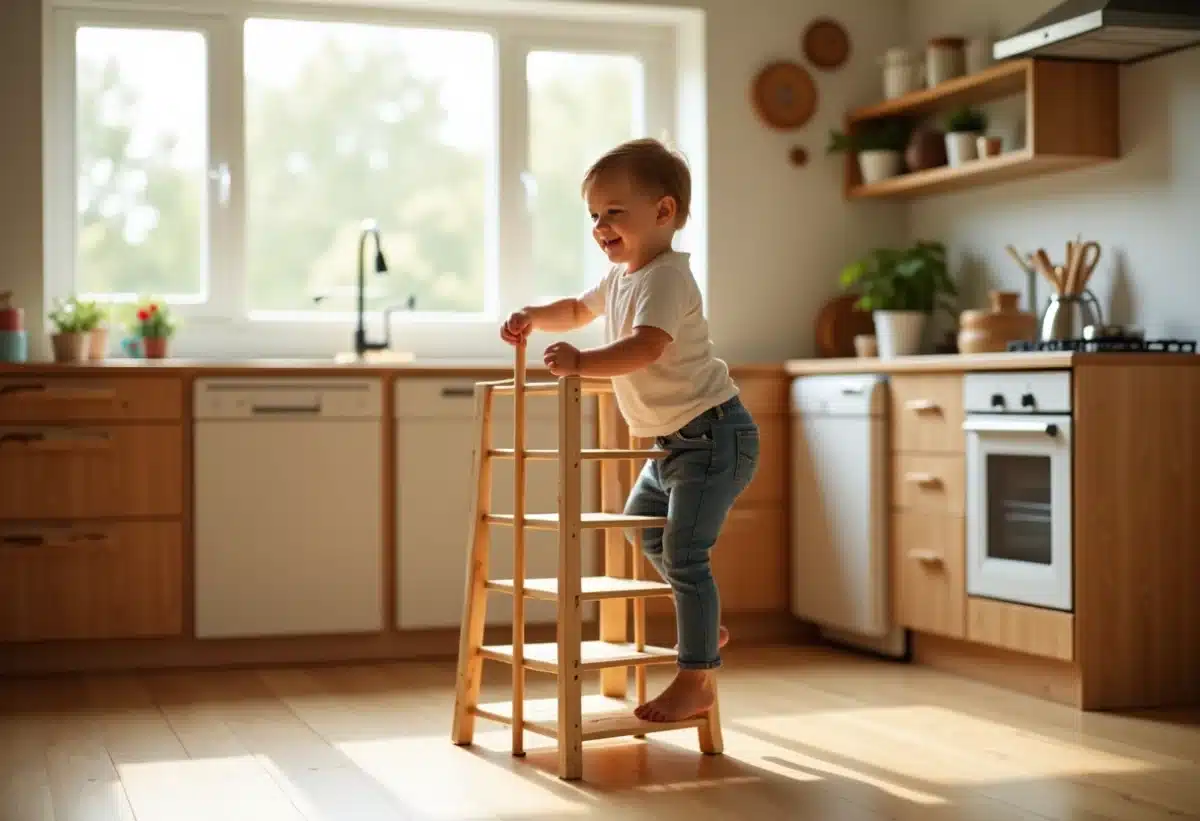 - Élévation sécurisée : la tour permet de surélever l’enfant à la hauteur des plans de travail, des tables ou des éviers, tout en assurant sa stabilité.
